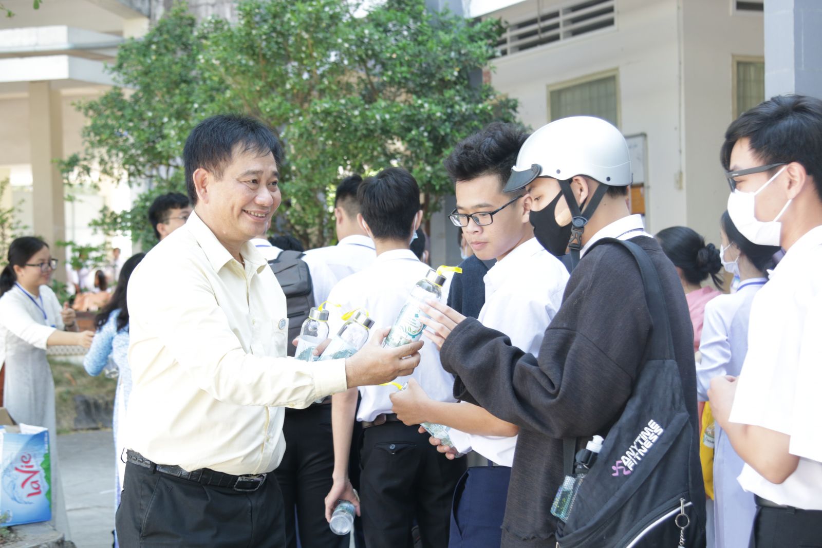 S. Nguyễn Tuấn Khanh – Hiệu trưởng Trường Đại học Kiên Giang tặng chai thủy tinh đựng nước cho học sinh Trường THPT Hồ Thị Kỷ (Cà Mau)